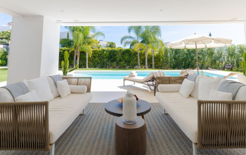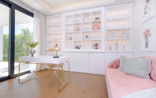 Located within an exclusive, fully gated residential community with 24-hour security, this outstanding contemporary villa occupies the largest plot in the development, offering exceptional privacy, generous space, and a prime setting. Set on an expansive 1,456 m² plot, the property boasts 637 m² of elegant interior living space, thoughtfully designed for refined modern Mediterranean living. The villa is surrounded by beautifully landscaped gardens and features a private swimming pool, multiple terraces, and a spectacular rooftop solarium with panoramic sea views. These outdoor areas are designed to maximize natural light and sun exposure throughout the day, creating the perfect environment to enjoy stunning sunsets. A stylish bioclimatic pergola, complete with a fully equipped outdoor kitchenette, enhances the outdoor lifestyle, making entertaining and al fresco dining effortless. Inside, the home offers a bright open-plan layout, seamlessly combining a designer kitchen, dining area, and spacious living room. Floor-to-ceiling windows flood the interiors with natural light while creating a seamless connection with the outdoor spaces. A private lift connects all levels of the villa, adding both convenience and a touch of luxury. The property features six spacious bedrooms, one of which is currently used as a home office, offering flexibility for modern living, whether for family life, guests, or remote work. Clean architectural lines, high-quality materials, and neutral tones create a sophisticated, turnkey residence ready to enjoy. The lower level is dedicated to comfort and entertainment, including a private home cinema, gym, and a functional laundry area. Combining contemporary design, expansive outdoor living, and premium features, this villa presents a unique opportunity as a permanent residence or an exceptional high-end holiday home in one of the most desirable gated communities.