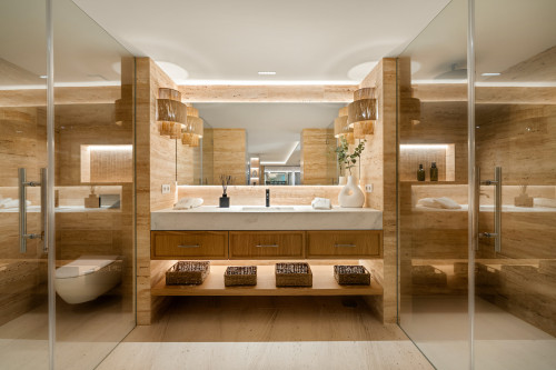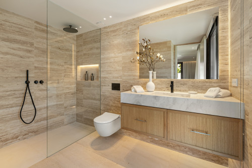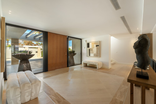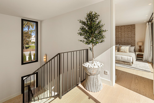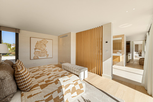 Villa Azteca is an enchanting villa nestled in the highly coveted Aloha area. This unique property boasts a fascinating architecture that harmoniously blends natural materials with modern design elements. From the symmetrical facade to the lush greenery at the entrance, the villa's exterior exudes elegance and sophistication. The sharp lines and clear windows add a touch of contemporary flair, while the traditional roof tiles give a nod to the local culture and heritage. Designed by GC Studio, the architecture and interiors reflect a refined balance of innovation and tradition. B. Solis handled the construction with impeccable craftsmanship, while the lush landscaping, created by Juan Pedro Sacedón Paisajismo, enhances the villa’s ambiance. Advanced home installations were executed by Techno Clima, ensuring the highest standards in comfort and efficiency. Inside, Villa Azteca offers a tasteful interior design featuring light neutral tones and natural materials. Wooden accents, such as the ribbed walls that separate the living area and kitchen, add warmth and character to the space. The property includes five luxurious bedrooms and an impressive living/dining area, ideal for entertaining guests or relaxing with family. With spectacular golf course views unique to Aloha in Nueva Andalucía, Villa Azteca is a truly remarkable property that offers the ultimate in luxury living.