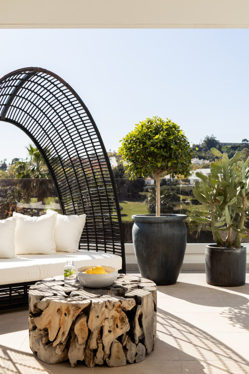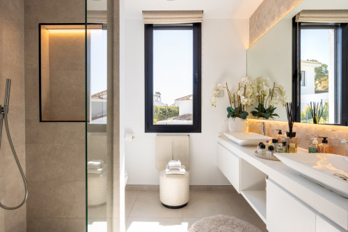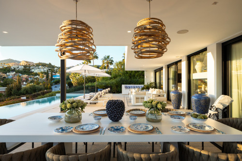 Contemporary villa set in the heart of Nueva Andalucía’s prestigious Golf Valley, enjoying a privileged west-facing orientation overlooking the renowned Los Naranjos Golf Course. Distributed across three levels, the residence captures sweeping views of manicured fairways and the surrounding landscape, creating a serene and sophisticated atmosphere. Expansive terraces open onto an infinity pool and elegant outdoor living areas, designed for effortless entertaining against a backdrop of greenery. Inside, floor-to-ceiling windows bathe the interiors in natural light, enhancing the seamless flow between refined living spaces and the outdoors. The open-plan kitchen, appointed with premium Miele appliances, combines sleek design with everyday functionality. Four spacious bedrooms, including a tranquil master suite with direct terrace access, offer comfort and privacy, while a dedicated entertainment level with a wine bodega adds an exclusive touch. A private garage and driveway complete this exceptional home, where contemporary design meets the timeless appeal of Marbella’s most sought-after golf setting.
