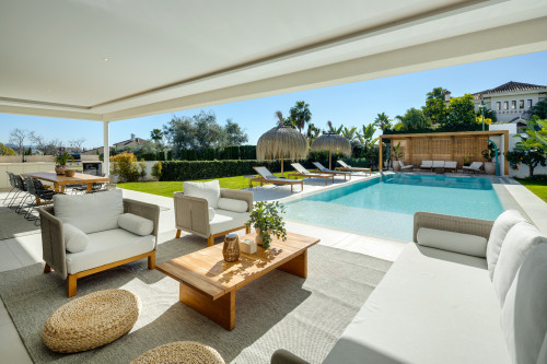 Cerquilla 54B is a modern villa in the prime residential area of La Cerquilla, offering an exceptional blend of luxury and convenience. Situated in Marbella’s sought-after Golf Valley, the property enjoys sea and mountain views while being just minutes from all key amenities. The villa’s contemporary design maximises natural light, with floor-to-ceiling glass sliding doors seamlessly connecting the indoor and outdoor living spaces. The open-plan layout enhances both functionality and sophistication, with a sleek modern kitchen featuring a central marble island and state-of-the-art integrated appliances. Designed for year-round enjoyment, the outdoor spaces are tailored for relaxation and entertainment. Ample terraces provide alfresco dining and chill-out areas, while the private pool is complemented by a stylish pergola at its end. An outdoor kitchenette with a built-in BBQ adds to the property's appeal, making it an ideal space for hosting gatherings. The floating staircase leads to the first floor, where five well-appointed bedrooms ensure both comfort and privacy. The master suite is particularly generous, with direct terrace access and a luxurious en-suite bathroom that captures the essence of high-end living. The villa also features an impressive entertainment level, complete with a custom bar and television area, perfect for socialising. Thoughtful lighting integrations bring the property to life at night, transforming the ambience both indoors and across the covered terraces. A private driveway leads to a secure entrance and carport, ensuring both privacy and exclusivity. Cerquilla 54B is a refined choice for those seeking a modern home in one of Marbella’s most desirable locations.