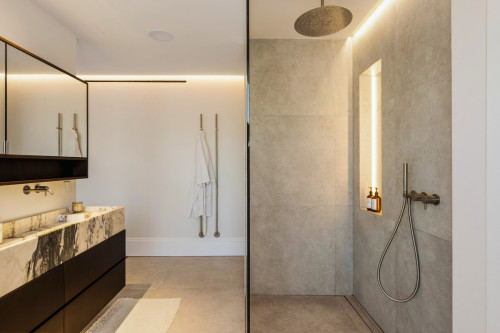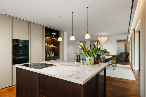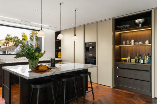Introducing this exceptional family residence, set within one of the most sought-after gated communities in Los Naranjos, Nueva Andalucía, just moments from one of Marbella’s finest golf courses. Recently renovated to the highest standards, this home presents a seamless blend of refined living, timeless elegance, and modern functionality. Every element has been meticulously considered, resulting in a property that exudes quality, character, and understated sophistication, perfectly suited to contemporary family life. Positioned on a flat, west facing plot, the home enjoys an abundance of natural light throughout the day, along with open, far reaching views. Its elevated setting enhances the sense of privacy and tranquillity, while offering vistas across to Los Naranjos Golf Course, stretching towards the distant mountain range beneath expansive blue skies. Upon arrival, you are welcomed by a beautifully landscaped Mediterranean garden, where a thoughtfully integrated water feature creates an immediate sense of calm and serenity. The main living level has been intelligently designed with an open-plan layout, where the entrance hall flows effortlessly into the living, dining, and kitchen areas creating a harmonious and inviting space for both everyday living and entertaining. The kitchen is fitted with top of the line Miele appliances and complemented by a stylish dry bar. A separate, concealed chef’s kitchen/scullery provides a highly practical extension, ideal for hosting and preparing meals while maintaining the elegance of the main living space. The home offers six bedrooms in total, thoughtfully distributed to suit family living. Five serve as spacious family bedrooms, while the sixth is designed as independent staff or nanny accommodation, complete with its own kitchenette, bathroom, and private access. Additional features include a dedicated home office, a fully equipped wellness level with gym, sauna, and indoor jacuzzi/plunge pool, as well as a superbly soundproofed home cinema. A private closed garage that accommodates one vehicle, complemented by a gated driveway with space for up to four additional cars. Throughout the property, premium finishes define the interiors, from herringbone wood flooring and bespoke carpentry to carefully selected natural stone and underfloor heating. A state-of-the-art security system further enhances the sense of comfort and peace of mind in additional to the secure community. The outdoor areas have been designed to embrace a true indoor-outdoor lifestyle. An elegant outdoor kitchen and bar area accompanying a magnificent heated saltwater swimming pool, complete with a mirrored overflow edge that creates a striking visual effect. This is a home that perfectly balances classic contemporary architecture with modern yet timeless interiors, offering not only a prime location and security, but a lifestyle of comfort, beauty, and effortless sophistication.
