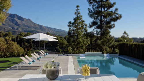 Welcome to Villa Celesta, an architectural masterpiece elevated 5 meters above the prestigious Aloha golf course, offering breathtaking, uninterrupted views of the iconic La Concha mountain. Thoughtfully designed for both smaller and larger families, this home effortlessly combines luxury and functionality, delivering a versatile living experience for all. This residence boasts a spectacular triple-height main living room, creating a grand yet welcoming ambiance. The open-plan dining room and kitchen are ideal for hosting, while shaded terraces provide the perfect setting for al fresco dining. Spend cozy evenings around the fire pit with sunken seating, or enjoy cinematic experiences in the dedicated cinema room. The wine cellar and games room add sophistication and entertainment to this exceptional home. Situated in the highly desirable area of Nueva Andalucia - Aloha, this property redefines the essence of Marbella living. Whether you desire tranquility or vibrant community life, it offers the perfect balance. Experience unmatched luxury and make this your ultimate sanctuary.