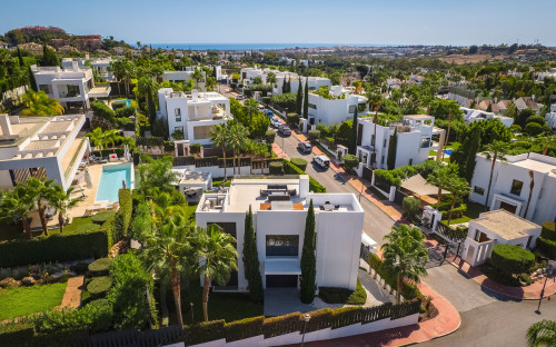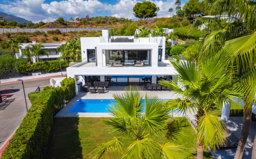 Built to top specifications and finishes, this 7-bedroom villa pays special attention to the Andalusian climate, with plenty of outside seating areas carefully shaded and perfect for relaxing. Distributed on three levels, it comprises, on the main floor: spacious living room with several seating areas; open-plan fully fitted kitchen/dining area equipped with top appliances and with a central island and wine cooler; en-suite guest bedroom; access to the porches, terraces, swimming pool and the carefully landscaped garden with mature plants that surround the property create privacy from nearby homes. Upstairs: two guest en-suite bedrooms with fabulous views over the Golf Valley; stunning master suite with dressing room and a wrap-around terrace also enjoying the amazing views. Lower level: further guest bedroom with en-suite bathroom; garage for 3 cars. Possibility to add a gym on this level. Special features include underfloor heating throughout (except in the basement), home automation system throughout. Just minutes away from several international schools, world class golf courses, gastronomic experiences and amenities, this magnificent home is set within a quiet gated complex with 24-hour security, guaranteeing a total privacy.