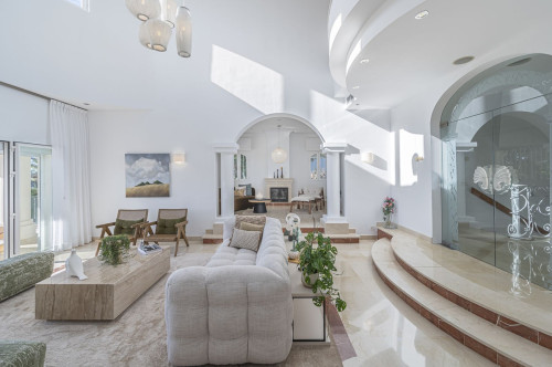 This magnificent villa located in the heart of the prestigious Golf Valley of Nueva Andalucia! This impressive property boasts of an expansive 1.425m2 of plot size and located first line golf. Entering the property, a huge driveway welcomes you to the well-maintained expansive garden area. This recently reformed villa has is divided into 4 floors plus attic, 7 bedrooms, 7 bathrooms, gust toilet, several living rooms and lounge areas, terraces and entertainment area. Upon entering this stunning villa, you will be greeted by a bright hallway with a high ceiling and access to the different areas of the main floor. To the right is a bedroom with ensuite bathroom which could also be an private office.On the left part, you will find a charming independent kitchen fully equipped with high quality appliances. Also, on the main floor you will find the dining area, a separate lounge area and a very chic sitting area with direct access to the terrace. Enjoy the best golf views on the large terrace with different spaces to have your meals or just relax and enjoy the sun and the fantastic views. Going up on the second floor, you will find two grand master bedrooms both with ensuite bathrooms (with bath and shower), both with access to the bright terrace. On the upper floor, you will find a spacious studio which could be used as an office, art studio, another bedroom etc. Going down to the lower floor, you will find, a spacious entertainment room with a cinema, bar, game area; 3 complete bedrooms and 3 bathrooms, a spacious living area-dining room and an open kitchen. We go out to the sunny porch area that leads out to the lush gardens with a beautiful swimming pool. On the lower floor, you will find a very spacious garage for 5-6 cars and a fully equipped gym area. This modern house is equipped with a lift in all floors, individual air-condition hot and cold, fireplace, underfloor heating, alarm system, electric blinds. This classic-style home is built with the best quality materials and modernized elegantly creating a luxurious home in one of the most exclusive areas of Marbella! Surrounded by the best golf courses such as Los Naranjos Golf, Magna Marbella, Las Brisas. Just a few minutes’ drive to the beach and Puerto Banus!
